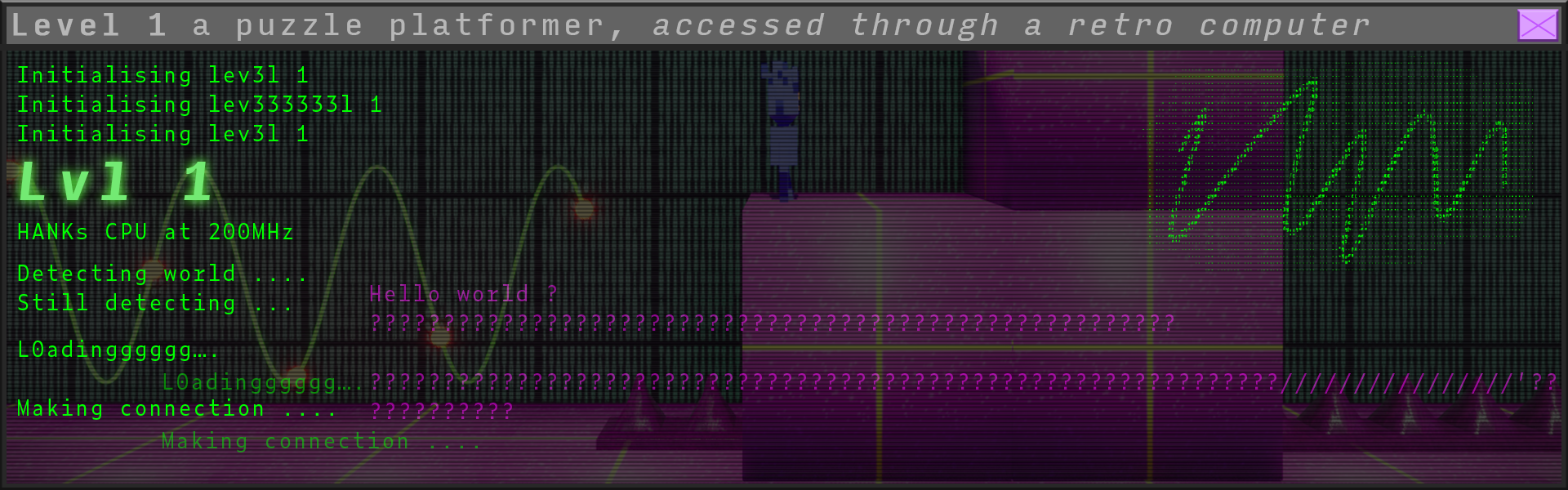 Enter cyberspace taking control of Hank’s virtual avatar, H4NK, to navigate a side-scrolling platformer filled with spikes, lasers, and timed quick events. The arcade-style world blends early PC aesthetics with neon visuals and digital glitches, while a quirky “bug” companion, literally a bug in the system, appears to guide you through the chaos.